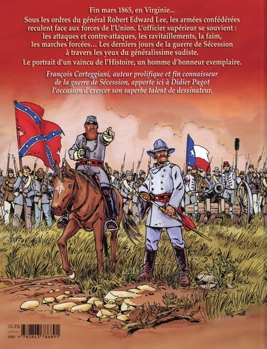 Fin mars 1865, en Virginie : sous les ordres du général Robert Edward Lee, les armées confédérées reculent face aux forces de l'Union. L'officier supérieur se souvient : les attaques et contre-attaques, les ravitaillements, la faim, les marches forcées... Les derniers jours de la guerre de Sécession à travers les yeux du généralissime sudiste. A propos de l'auteur : Didier Pagot est un dessinateur professionnel français, né en 1966. En 2021, il a publié aux Editions du Triomphe le premier tome de la bande dessinée d'anticipation militaire Colonel Mareuil. François Corteggiani, auteur prolifique, fin connaisseur de la guerre de Sécession, est scénariste depuis 1990 de La jeunesse de Blueberry (Dargaud). Au Triomphe, il a déjà signé Cadoudal et Avec les Cristeros.