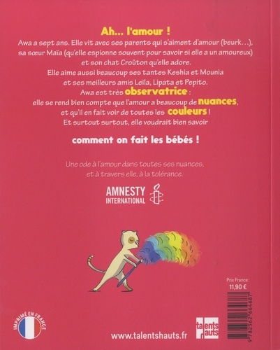 Awa a sept ans. Elle vit avec ses parents qui s'aiment d'amour (beurk. . . ), sa soeur Maïa (qu'elle espionne souvent pour savoir si elle a un amoureux) et son chat Croûton qu'elle adore.