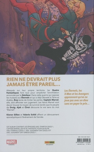 L'heure du Jugement dernier est venu, et Dieu a décidé que c'en était fini de l'humanité, des mutants ET des Eternels. Lorsqu'un Céleste omnipotent décrète que la Terre doit être détruite, y a-t-il autre chose à faire que de désespérer ? Une petite poignée de héros rescapés va tenter le tout pour le tout pendant que Captain America fait diversion, mais pour que le Salut soit possible, des sacrifices seront nécessaires, et plus rien ne sera comme avant pour les Eternels, les X-Men et les Avengers. Kieron Gillen (Eternals, Immortal X-Men) continue de nous passionner avec cette intrigue où les héros ont autant d'importance que le quidam de l'univers Marvel. Dans ce dernier acte, la tension monte encore d'un cran et certains personnages ne survivront pas à l'évènement. Les multiples rebondissements font de Judgment Day un des crossovers les plus palpitants de la longue histoire Marvel.
