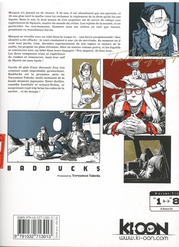 Entre mafia et police, la cavale au long cours de deux hors-la-loi... et d'un bébé ! Morgan n'a jamais eu de chance. A 10 ans, il est abandonné par ses parents, et 20 ans plus tard la mafia vient lui réclamer le règlement de la dette qu'ils lui ont léguée. Sans le sou, le seul moyen de s'en acquitter est de servir de cobaye aux expériences de Nguyen, maître du monde du crime. Les rejetés de la société, et en particulier les non-humains, finissent sous ses ordres en tant que tueurs, prostitués ou travailleurs forcés. Morgan se réveille avec un tube dans la nuque et... une force exceptionnelle ! Son identité a été effacée : le voici condamné à une vie de servitude. Au moment où il croit tout perdu, Lisa, dernière représentante de son espèce et esclave de la mafia, lui propose un plan d'évasion. Rien ne tourne comme prévu, et les fugitifs se retrouvent avec un bébé dans leurs bagages ! Peu importe, ils font avec... Les deux comparses n'ont ni expérience du combat ni ressources, mais leur soif de liberté est sans égale ! Cavale de plus d'une décennie d'un trio criminel aussi improbable qu'attachant, Badducks est la première série de Toryumon Takeda, étoile montante de la bande dessinée japonaise. Entre thriller, comédie familiale et science-fiction, ce surprenant road trip brise les codes de la société... et du manga !
