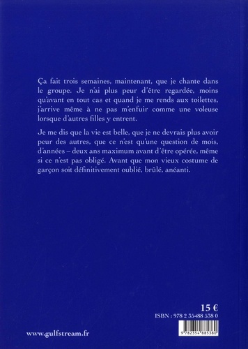 Ca fait trois semaines, maintenant, que je chante dans le groupe. Je n'ai plus peur d'être regardée, moins qu'avant en tout cas et quand je me rends aux toilettes, j'arrive même à ne pas m'enfuir comme une voleuse lorsque d'autres filles y entrent. Je me dis que la vie est belle, que je ne devrais plus avoir peur des autres, que ce n'est qu'une question de mois, d'années - deux ans maximum avant d'être opérée, même si ce n'est pas obligé. Avant que mon vieux costume de garçon soit définitivement oublié, brûlé, anéanti.