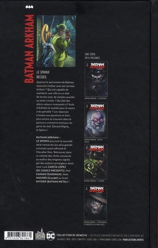 Quel est le seul ennemi de Batman à pouvoir rivaliser avec son cerveau brillant ? Qui est capable de maintenir une ville en état de terreur avec de simples puzzles ou mots croisés ? Qui fait des allers-retours incessants à l'Asile d'Arkham et semble pour le moins irrécupérable ? Les réponses à toutes ces questions et bien plus encore, se trouvent dans le parcours criminel et tortueux du génie du mal : Edward Nygma, le Sphinx !