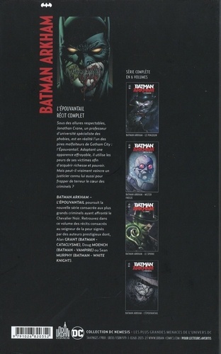 Sous des allures respectable, Jonathan Crane, un professeur d'université spécialiste des phobies, est en réalité un des pires malfaiteurs de Gotham City : l'épouvantail. Adoptant une apparence effroyable, il utilise les peurs de ses victimes afin d'acquérir richesse et pouvoir. Mais peut-il vraiment vaincre un justicier connu lui aussi pour frapper de terreur le coeur des criminels ? Batman Arkham - L'épouvantail poursuit la nouvelle série consacrée aux plus grands criminels ayant affronté le Chevalier Noir. Retrouvez dans ce volume des récits consacres au seigneur de la peur signés par des auteurs prestigieux dont, Alan Grant (Batman - Cataclysme), Doug Moench (Batman - Vampire) ou Sean Murphy (Batman- White Knight).