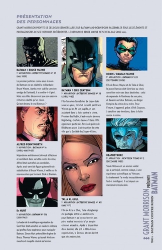 Tandis que Batman et Robin arpentent les couloirs de leur manoir, à la recherches d'indices sur la disparition de Bruce Wayne, le Dr Hurt rassemble ses troupes afin de conquérir Gotham City. Et lorsque Talia al Ghul désire reprendre le contrôle de son fils, elle porte un coup fatidique à l'équilibre fragile de ce nouveau Dynamique Duo. Grant Morrison (Joe, l'aventure intérieure) poursuit son cycle révolutionnaire sur le héros de Gotham City. Après avoir complètement remanié les justiciers Batman et Robin, il orchestre leur rencontre avec le Batman originel, servie par des dessinateurs de renom comme Frazer Irving (Seven soldiers of victory), Cameron Stewart (Catwoman) et David Finch (Batman - La nouvelle aube). Cette édition présente également une vingtaine de pages de recherches et commentaires du scénariste.