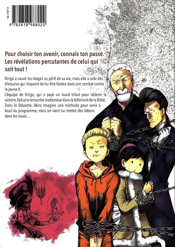 Pour choisir ton avenir, connais ton passé. Les révélations percutantes de celui qui sait tout !! Ringo a sauvé les otages au péril de sa vie, mais elle a subi des blessures qui risquent de lui être fatales dans son combat contre le jeune X. L'équipe de Ringo, qui a payé un lourd tribut pour obtenir la victoire, fait une rencontre inattendue dans le bâtiment de la Diète. Dans le Désastre, Akira imagine une méthode pour venir à bout du programme, mais on vient lui mettre des bâtons dans les roues...