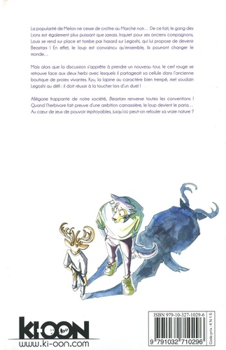La popularité de Melon ne cesse de croître au Marché noir... De ce fait, le gang des Lions est également plus puissant que jamais. Inquiet pour ses anciens compagnons, Louis se rend sur place et tombe par hasard sur Legoshi, qui lui propose de devenir Beastars ! En effet le loup est convaincu qu'ensemble ils pourront changer le monde... Mais alors que la discussion s'apprête a prendre un nouveau tour, le cerf rouge se retrouve face aux deux herbi avec lesquels il partageait sa cellule dans l'ancienne boutique de proies vivantes. Kyu, la lapine au caractère bien trempé, met soudain Legoshi au défi : il doit réussir à la toucher lors d'un duel ! Allégorie frappante de notre société. Beastars renverse toutes les conventions ! Quand l'herbivore fait preuve d'une ambition carnassière, le loup devient le paria... Au coeur de jeux de pouvoir impitoyables, jusqu'où peut-on refouler sa vraie nature ?