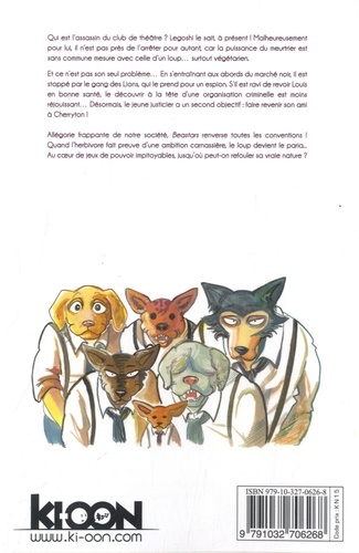 Qui est l'assassin du club de théâtre ? Legoshi le sait à présent ! Malheureusement pour lut il n'est pas près de l'arrêter pour autant car la puissance du meurtrier est sans commune mesure avec celle d'un loup... surtout végétarien. Et ce n'est pas son seul problème... En s'entraînant aux abords du marché noir, il est stoppé par le gang des Lions, qui le prend pour un espion. S'il est ravi de revoir Louis en bonne santé, le découvrir à la tête d'une organisation criminelle est moins réjouissant... Désormais, le jeune justicier a un second objectif : faire revenir son ami a Cherryton ! Allégorie frappante de notre société, Keastars renverse toutes les conventions ! Quand l'herbivore fait preuve d'une ambition carnassière, le loup devient le paria.. Au coeur de feux de pouvoir impitoyables, jusqu'où peut-on refouler sa vraie nature ?