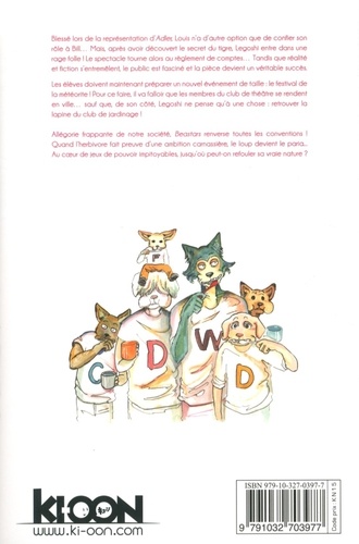 Au milieu des haines et des peurs viscérales, qui s'emparera du trône du Beastar ? A l'institut Cherryton, herbivores et carnivores vivent dans une harmonie orchestrée en détail. La consommation de viande est strictement interdite, et les dortoirs sont séparés en fonction des régimes alimentaires. Tout pourrait aller pour le mieux dans le meilleur des mondes... mais la culture ne peut étouffer tous les instincts. Quand le cadavre de l'alpaga Tem est retrouvé déchiqueté sur le campus, les méfiances ancestrales refont surface ! Legoshi est la cible de toutes les suspicions. Parce qu'il était proche de Tem, parce qu'il est une des dernières personnes à avoir été vues en sa compagnie, et surtout... parce que c'est un loup. Pourtant, sensible et timide, il fait son possible pour réprimer ses instincts. Hélas, ses efforts sont vains face au vent de discrimination qui souffle sur le pensionnat... Le seul qui pourra apaiser ce climat de terreur est le Beastar, le leader de l'école. Pour l'heure, les candidats se préparent, les élections approchent... Le favori n'est autre que le cerf Louis, étoile incontestée du club de théâtre auquel appartient Legoshi. Bien décidé à remettre les carnivores à leur place, il fait mine de ne pas craindre les crocs acérés du loup gris. Mais peut-être serait-il mieux avisé de ne pas le sous-estimer ! Allégorie frappante de notre société, Beastars renverse toutes les conventions ! Quand l'herbivore fait preuve d'une ambition carnassière, le loup devient le paria... Au coeur de jeux de pouvoir impitoyables, jusqu'où peut-on refouler sa vraie nature ?