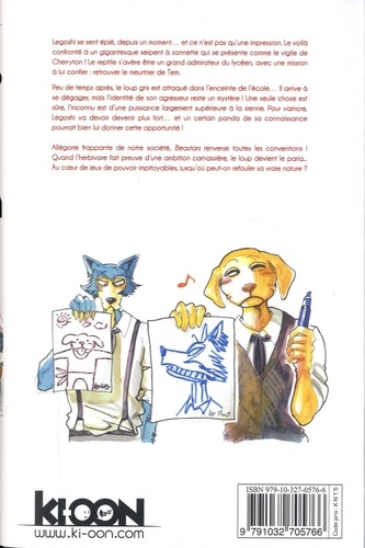 Legoshi se sent épié, depuis un moment... et ce n'est pas qu'une impression Le voila Confronté d un gigantesque serpent d sonnette qui se présente comme le vigile de Cherryton ! Le reptile s'avère être un grand admirateur du lycéen, avec une mission d lui confier : retrouver le meurtrier de Tem. Peu de temps après, le loup gris est attaqué dans l'enceinte de l'école... Il arrive d se dégager, mais l'Identité de son agresseur reste un mystère I Une seule chose est sore, l'inconnu est d'une puissance largement supérieure a la sienne. Pour vaincre, Legoshi va devoir devenir plus fort... et un certain panda de sa Connaissance pourrait bien lui donner cette opportunité ! Allégorie frappante de notre société, Beastars renverse toutes les conventions Quand l'herbivore fait preuve d'une ambition carnassière, le loup devient le paria... Au coeur de ! eux de pouvoir impitoyables, Jusqu'où peut-on refouler sa vraie nature ?