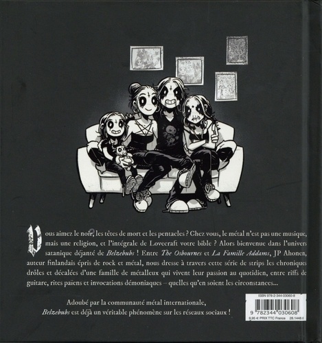 Back in blagues Vous aimez le noir, les têtes de mort et les pentacles ? Chez vous, le metal n'est pas une musique, mais une religion, et l'intégrale de Lovecraft votre bible ? Alors bienvenue dans l'univers satanique déjanté de Belzebubs ! Entre The Osbournes et La Famille Addams, JP Ahonen, auteur finlandais épris de rock et metal, nous dresse à travers cette série de strips les chroniques drôles et décalées d'une famille de métalleux qui vivent leur passion au quotidien quelles qu'en soient les circonstances, entre riffs de guitare, rites païens et invocations démoniaques. Adoubé par la communauté metal internationale, Belzebubs est déjà un véritable phénomène sur les réseaux sociaux puisque sa page facebook a atteint les 175 000 fans en quelques mois, chaque strip publié récoltant des dizaines de milliers de likes et de partages. Aujourd'hui, ce projet drôle et singulier paraît pour la première fois dans un album relié de plus de 100 pages, avec quantité d'inédits ! Prêts pour un voyage au coeur de la bête ?
