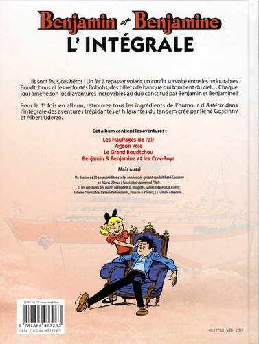 Ils sont fous, ces héros ! Un fer à repasser volant, un conflit survolté entre les redoutables Boudtchous et les redoutés Bobohs, des billets de banque qui tombent du ciel... Chaque jour amène son lot d'aventures incroyables au duo constitué par Benjamin et Benjamine ! Pour la 1e fois en album, retrouvez tous les ingrédients de l'humour d'Astérix dans l'intégrale des aventures trépidantes et hilarantes du tandem créé par René Goscinny et Albert Uderzo. 4 aventures complètes de Benjamin & Benjamine- 148 pages de B. D. Un dossier de 30 pages inédites sur les années clés qui ont conduit René Goscinny et Albert Uderzo à la création du journal Pilote. Et les aventures des autres héros de B. D. imaginés par les créateurs d'Astérix : Antoine l'invincible, La Famille Moutonet, Poussin & Poussif, La Famille Cokalane...