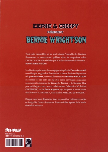 Voici enfin rassemblées en un seul volume l'ensemble des histoires, illustrations et couvertures, publiées dans les magazines cultes CREEPY et EERIE et réalisées par le maître incontesté de l'horreur : Bernie Wrightson ! Les histoires présentées dans ces pages, adaptées de Poe ou Lovecraft ou créées par les grands scénaristes de la bande dessinée d'épouvante tels que Bruce Jones, vont vous faire découvrir Bernie Wrightson au sommet de son art ! Ses superbes récits horrifiques susciteront notamment l'admiration de George A. Romero et de Stephen King pour qui il signera entre autres collaborations l'adaptation BD du film Creepshow, ou de Dario Argento, qui adaptera le monstrueux chef-d'oeuvre «Jenifer», dans la série Master of Horror. Plongez-vous avec délectation dans ce recueil et redécouvrez enfin en intégralité l'oeuvre fondatrice d'une véritable légende de la bande dessinée d’horreur !