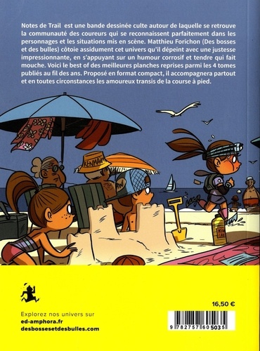 Notes de Trail est une bande dessinée culte autour de laquelle se retrouve la communauté des coureurs qui se reconnaissent parfaitement dans les personnages et les situations mis en scène. Matthieu Forichon (Des bosses et des bulles) côtoie assidument cet univers qu'il dépeint avec une justesse impressionnante, en s'appuyant sur un humour corrosif et tendre qui fait mouche. Voici le best of des meilleures planches reprises parmi les 4 tomes publiés au fil des ans. Proposé en format compact, il accompagnera partout et en toutes circonstances les amoureux transis de la course à pied.