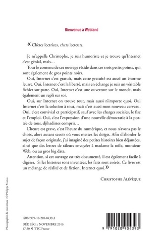 "Chères lectrices, chers lecteurs, je m'appelle Christophe, je suis humoriste et je trouve qu'Internet c'est génial, mais... Tout le contenu de cet ouvrage réside dans ces trois petits points, qui sont également de gros points noirs. Oui, Internet c'est gratuit, mais cette gratuité est aussi un énorme leurre. Oui, Internet c'est la liberté, mais en échange je suis un véritable fichier sur patte. Oui, Internet c'est une ouverture sur le monde, mais également un repli sur soi. Oui, sur Internet on trouve tout, mais aussi n'importe quoi. Oui Internet c'est la solution à tout, mais c'est aussi mon nouveau cerveau. Oui, c'est convivial et participatif, sauf avec les charges sociales, le fisc et l'emploi. Oui, c'est l'expression d'une nouvelle démocratie à la portée de tous, djihadistes compris... L'heure est grave, c'est l'heure du numérique, et nous n'avons pas le choix, alors autant savoir où vous mettez les doigts. Afin d'aborder le sujet de façon originale, j'ai imaginé des petites histoires bien déjantées, ainsi que des lettres de râleurs envoyées à madame la toile, monsieur Web, ou au gros big data. Attention, si cet ouvrage est très documenté, il est également facile à digérer. Si les histoires sont inventées, les faits sont avérés. Ce livre est un mélange de réalité et de fiction, Internet quoi". Christophe Alévêque