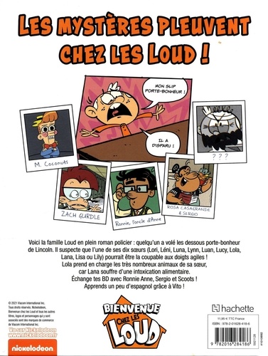 Les mystères pleuvent chez les Loud ! Voici la famille Loud en plein roman policier : quelqu'un a volé les dessous porte-bonheur de Lincoln. Il suspecte que l'une de ses dix soeurs (Lori, Léni, Luna, Lynn, Luan, Lucy, Lola, Lana, Lisa ou Lily) pourrait être la coupable aux doigts agiles ! Lola prend en charge les très nombreux animaux de sa soeur, car Lana souffre d'une intoxication alimentaire. Echange tes BD avec Ronnie Anne, Sergio et Scoots ! Apprends un peu d'espagnol grâce à Vito !
