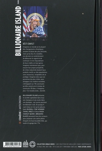Imaginez un monde où la plupart des changements climatiques seraient la faute des plus fortunés, mais qu'au lieu d'y remédier ces derniers se contenteraient de détourner le regard et de continuer à vivre impunément de leurs trafics en tout genre. Imaginez maintenant que, pour assurer leur propre prospérité, de riches industriels testent leurs produits nocifs sur des populations sans ressources, incapables de se protéger. Imaginez alors que ces personnes les plus riches, pour échoppera la vindicte mondiale, s'échappent sur l'île sanctuaire qu'elles auront pris le temps de construire. Eh bien, n'imaginez plus ! Ce monde existe... bientôt. Billionaire island présente la société capitaliste dans tous ses manques et ses excès dans une dystopie... qui sonne pourtant terriblement vraie. Et puisqu'il vaut mieux en rire qu'en pleure, Mark Russell (The wonder Twins, Prez) et Steve Pugh (Harley Quinn Breaking glass) poussent tous les curseurs pour proposer une satire pleine d'esprit et dune brutalité folle, qui saute à la gorge des 1%.