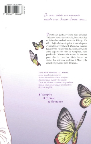 Dans Black Rose Alice D. C. Al Fine, conte macabre et moderne, Setona Mizushiro revisite le mythe du vampire de manière étonnante. Entre parasitisme et amours impossibles, laissez-vous envoûter par les méandres de cette tragédie. Dimitri est parti à Vienne pour enterrer Théodore sur sa terre natale, laissant Alice et Kai seuls dans la demeure de Shibuya. En effet, Reiji a lui aussi quitté le manoir pour s'installer avec Edward. Quand ce dernier lui apprend l'existence du stimmgabel, une arme capable de tuer les vampires, Reiji profite de l'absence du maître de maison pour aller la chercher. Mais durant sa visite, il se retrouve seul face à Alice, et la situation pourrait bien déraper...