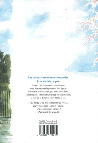 Les saisons auront beau se succéder, je ne t'oublierai pas. Tôma a une discussion à coeur ouvert avec Futaba pour la première fois depuis l'incident. De son côté, pris entre deux feux, Taichi se sent tiraillé et submergé par la situation, il met de la distance entre Tôma et lui. Tôma finit par ne plus se montrer au lycée... que vont décider Taichi et Futaba ? Quels choix vont-ils faire ? Quel avenir les attend ?