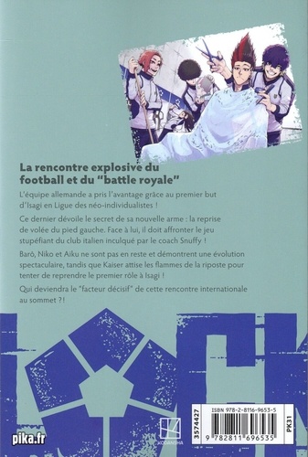 La rencontre explosive du football et du "battle royale". L'équipe allemande a pris l'avantage grâce au premier but d'Isagi en Ligue des néo-individualistes ! Ce dernier dévoile le secret de sa nouvelle arme : la reprise de volée du pied gauche. Face à lui, il doit affronter le jeu stupéfiant du club italien inculqué par le coach Snuffy ! Barô, Niko et Aiku ne sont pas en reste et démontrent une évolution spectaculaire, tandis que Kaiser attise les flammes de la riposte pour tenter de reprendre le premier rôle à lsagi ! Qui deviendra le "facteur décisif" de cette rencontre internationale au sommet ? !