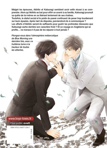 Malgré les épreuves, Akihito et Kalsuragi semblent avoir enfin réussi à se comprendre. Alors qu'Akihito se bat pour offrir un avenir à sa famille, Katsuragi poursuit sa guète de lui-même en se libérant lentement de ses chaînes. Toutefois, le statut social et le poids du passe continuent de peser trop lourdement sur leurs épaules. Après tant de disputes, parviendront-ils à communiquer ? Les efforts d'Akihito seront-Ils suffisants pour guérir les profondes blessures que Katsuragi cache derrière son caractère froid ? Et ce voyage en Angleterre qui se profile... ne menace-t-il pas de les séparer à tout jamais ? Plongez-vous dans l'atmosphère mélancolique de Blue Morning une dernière fois, avec ce huitième tome à la hauteur de toutes las attentes.