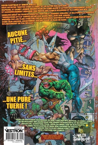 Kevin Eastman et Simon Bisley, deux artistes légendaires et le duo le plus bad-ass de lunivers des Tortues Ninja : RAPHAEL et CASEY JONES réunis pour un comic-book daction hyper violent, grotesquement gore et dangereusement dingue... Un album incontournable pour les grands fans des TMNT et tous les nostalgiques des comics bourrins et allumés des 90s ! Dans les bas-fonds cradingues du New York des 90s, Raphael et Casey Jones se retrouvent impliqués dans une vendetta sanglante où se croisent racailles, gangsters, flilcs, cyborgs, gros calibres, uzis en surchauffe, lames tranchantes et (bien sûr) crosses de hockey... Ne manquez pas ce qui est peut-être la plus longue fusillade de lHistoire des comics ! Après ROBOCOP vs. TERMINATOR par Frank Miller et Walt Simonson, Vestron ramène un autre comic-book CULTE des 90s demeuré jusquici inédit en France. Véritable légende urbaine, BODYCOUNT existe vraiment et arrive chez vous, meilleur que jamais.