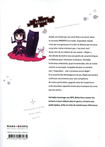 Kaede est invitée par son amie Risa à se lancer dans le nouveau MMORPG à la mode. Cependant, Kaede n'est pas une gameuse et si elle ne déteste pas les jeux, ce qu'elle n'aime vraiment pas, c'est avoir mal ! Aussi, lors de la création de son avatar "Maple", elle décide de mettre tous ses points de caractéristiques en Défense pour minimiser la douleur. Véritable forteresse ambulante, quasi invulnérable, elle se traîne comme un escargot, incapable de jeter le moindre sort ! Cependant... elle n'encaisse aucun dégât ! A la surprise des développeurs du jeu, Maple parviendra à éliminer ses ennemis avec une compétence de contre particulière, gagnant ainsi de l'expérience et de nouvelles capacités toutes plus loufoques les unes que les autres... Véritable hommage aux RPG, Bofuri fera revenir les lecteurs à leurs débuts dans le genre, à travers une quête épique, drôle et riche de nombreuses références.