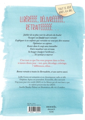 Tout se joue après 64 ans. Libéréééé, délivréééééé, retraitéééééé... Jubiler de ne plus voir les abrutis du boulot. Occuper son mari retraité. Expliquer à ses enfants que retraitée ne veut pas dire nounou. Optimiser ses copines. Rester dans le coup sans travailler. Faire mouliner son cerveau. Se bouger (malgré l'arthrose)... ... Et surtout se marrer. C'est tout ce que l'on vous propose dans ce livre à travers divers jeux - test, quiz, décodage, coloriage, 7 différences, rébus... Bonne retraite à toutes les Bernadette, et aux autres aussi.