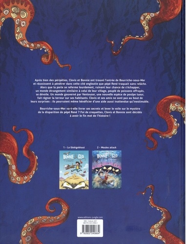 Après bien des péripéties, Clovis et Bannie ont trouvé l'entrée de Bourriche-sous-Mer et réussissent à pénétrer dans cette cité engloutie que pépé René traquait sans relâche. Alors que la porte se referme lourdement, ruinant leur chance de s'échapper, un monde étrangement similaire à celui de leur village, peuplé de poissons effrayés, se dévoile. Un monde gouverné par Ventousor, une nouvelle espèce de poulpe tueur, Fait régner la terreur sur ses habitants. Clovis et ses amis ne sont pas au bout de leurs surprises : ils pourraient même bénéficier d'une aide aussi inattendue qu'inestimable. Bourriche-sous-Mer va-t-elle livrer ses secrets et lever le voile sur le mystère de la disparition de pépé René ? Foi de croquettes, Clovis et Bonnie sont décidés à avoir le fin mot de l'histoire !