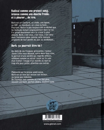 Radical comme une protest song, intense comme une douche froide, et drôle à en pleurer. Borb est un clochard, un clodo, une épave, un SDF, un mendiant, un crève-la-faim... bref, un déchet de la société. Borb, c'est aussi notre fils, notre cousin, notre frère en humanité. Borb, c'est cette réalité qu'on ne veut pas voir et que Jason Little nous envoie en pleine face. A travers une succession de strips mordants, l'auteur nous dépeint le quotidien de ce sans-abri dans une comédie douce-amère, à la fois touchante et hilarante. Le comique de situation, parfois quasi-muet, y est bienveillant et fait toute la force du livre : ce portrait poignant offre une représentation de la misère dotée d'un savant mélange d'humour grinçant et de gravité. New York en est le décorum, la misère répond à certains standards américains, mais l'universalité de ce conte tragique la rend transposable n'importe où en occident. Borb est un livre qui secoue son lecteur, qui ne laisse pas indemne et qui, pourtant, arrive à faire rire. Borb c'est radical comme une protest song, intense comme une douche froide, et drôle à en pleurer.