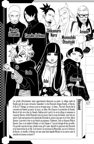Une nouvelle génération de ninjas débarque à Konoha ! Ada, qui a commencé à vivre dans le village de Konoha, convoque Sarada et Sumire pour discuter entre filles. De quoi vont-elles parler ? ! Quant à Kawaki, il sent la présence de Momoshiki caché à l'intérieur de Boruto et prend une grande décision... Pour le village et Boruto s'opère un grand changement !