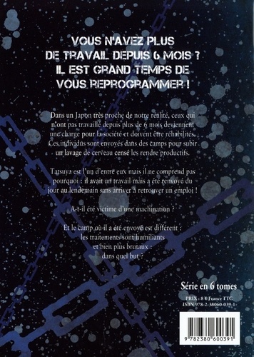 Vous n'avez pas travaillé depuis plus de 6 mois ? Il est grand temps de vous rééduquer ! Dans un Japon proche de notre réalité, celui qui n'a pas travaillé depuis plus de six mois devient une charge pour la société et doit être réhabilité. Les individus sont envoyés dans des camps pour subir un lavage de cerveau sensé les rendre productifs. Tetsuya est l'un d'eux mais il ne comprend pas pourquoi : il avait un travail mais a été renvoyé du jour au lendemain sans possibilité de retravailler ! A-t-il été victime d'une machination ? Et le camps dans lequel il a été envoyé est différent : les traitements sont humiliants et bien plus brutaux : dans quel but ? Un manga percutant en 6 tomes !