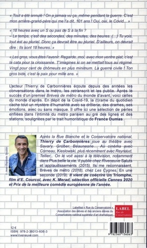 Après les "brèves de comptoirs" et les premières "brèves de métro", l'acteur Thierry de Carbonnières qu'on a vu dans "Plus belle la vie" restitue les perles qu'il entend dans les wagnons, avant ou depuis les masques obligatoires. Des saynètes drôles, tendres, humaines, trop humaines. - Une saison deux des perles entendues dans le métro, pleines d'humour et de tendresse - La restitution d'un auteur, acteur au quotidien et vu dans "Plus belle la vie" et aujourd'hui co-scénariste avec Emmanuel Courcol du film "Un triomphe" avec Kad Merad (sélection officielle Cannes 2020 et Prix du public au festival d'Angoulême) - Un petit livre i llustré par l'artiste France Dumas habituée aux reportages dessinés