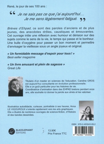Brèves d'Ehpad, ce sont des paroles d'anciens et de plus jeunes, des anecdotes drôles, caustiques et émouvantes. Cet ouvrage initie une réflexion avec humour et dérision sur des sujets comme le sens de la vie, le temps qui passe et le bonheur. Une bulle d'oxygène pour passer un bon moment et permettre d'envisager la vieillesse sous un angle joyeux et original.
