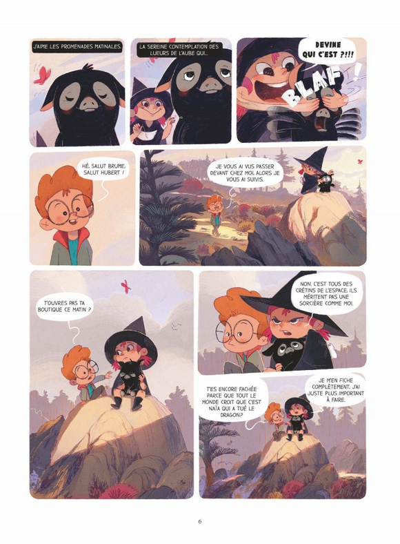 Le grand frisson Après avoir terrassé le dragon, Brume apprend qu'elle est en possession du grimoire de Naïa, la puissante sorcière qui veillait jadis sur son village et qui a disparu depuis de longues années. La fillette est bien décidée à dissiper le mystère qui entoure cette disparition ! Toujours accompagnée de son fidèle assistant, le petit cochon Hubert, et d'Hugo son meilleur ami, Brume entreprend la plus dangereuse des quêtes : trouver l'antre de Naïa ! La bâtisse se situerait au plus profond de la forêt des âmes perdues, or selon la légende, quiconque pénètre dans ces bois hantés se perd pour l'éternité... Nos aventuriers vont rapidement se retrouver en très mauvaise posture car dans les profondeurs de la forêt, là où le soleil ne brille jamais, une créature terrible rôde... Brume va-t-elle réussir à s'approcher de Naia et à rassembler par la même occasion les morceaux de sa propre histoire ? Perdus, nos trois amis sortiront-ils indemnes de leur expédition ? Toujours aussi drôle et inventive, Brume poursuit son chemin et affirme son caractère à travers cette série désopilante qui continue de nous faire rire avec des dialogues savoureux, un dessin doux et soigné et une héroïne fort attachante.