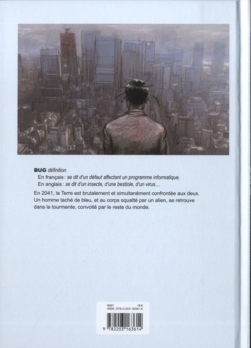 BUG définition : En français : se dit d'un défaut affectant un programme informatique. En anglais : se dit d'un insecte, d'une bestiole, d'un virus... En 2041, la Terre est brutalement et simultanément confrontée aux deux. Un homme taché de bleu, et au corps squatté par un alien, se retrouve dans la tourmente, convoité par le reste du monde.