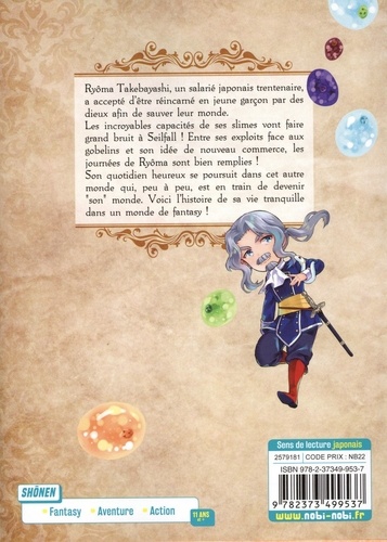 Ryôma Takebayashi, un salarié japonais trentenaire, a accepté d'être réincarné en jeune garçon par des dieux afin de sauver leur monde. Les incroyables capacités de ses slimes vont faire grand bruit à Seilfall ! Entre ses exploits face aux gobelins et son idée de nouveau commerce, les journées de Ryôma sont bien remplies ! Son quotidien heureux se poursuit dans cet autre monde qui, peu à peu, est en train de devenir "son" monde. Voici l'histoire de sa vie tranquille dans un monde de fantasy !