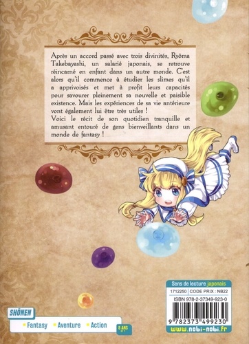 Après un accord passé avec trois divinités, Ryôma Takebayashi, un salarié japonais, se retrouve réincarné en enfant dans un autre monde. C'est alors qu'il commence à étudier les slimes qu'il a apprivoisés et met à profit leurs capacités pour savourer pleinement sa nouvelle et paisible existence. Mais les expériences de sa vie antérieure vont également lui être très utiles ! Voici le récit de son quotidien tranquille et amusant entouré de gens bienveillants dans un monde de fantasy !