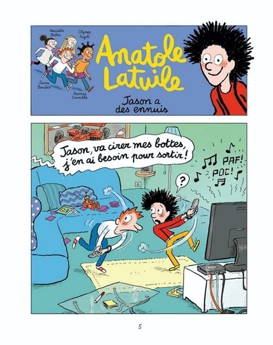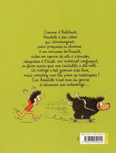 Comme d'habitude, Anatole a des idées qui déménagent : pour préparer sa chienne à un concours de beauté, aider un copain de colo à s'évader, récupérer à l'école son matériel confisqué, ou faire croire que son cartable a été volé... Le ratage n'est jamais très loin, mais comptez sur lui pour se rattraper ! Car Anatole n'est pas du genre à décevoir son entourage...