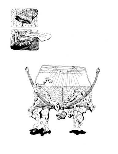 Avec un dessin inventif et libre, Oriane laisse son trait envahir la page et raconter en déformant en maltraitant ses personnages, tout en gardant un réalisme quasi-documentaire des situations. Le voyage en voiture devient une plongée kafkaïenne angoissante et oppressante, un huis clos entre 4 portières et une famille de quatre personnes prête à se détester tout le temps que durera l'infernal trajet.