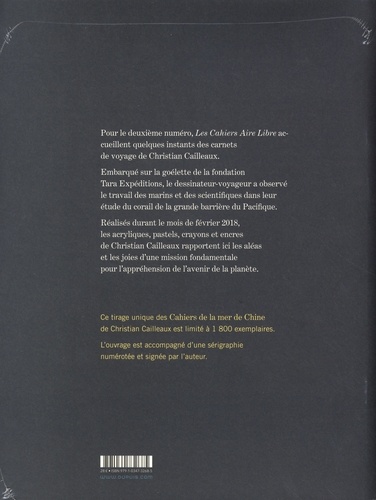Pour le deuxième numéro, Les Cahiers Aire Libre accueillent quelques instants des carnets de voyage de Christian Cailleaux. Embarqué sur la goélette de la fondation Tara Expéditions, le dessinateur-voyageur a observé le travail des marins et des scientifiques dans leur étude du corail de la grande barrière du Pacifique. Réalisés durant le mois de février 2018, les acryliques, pastels, crayons et encres de Christian Cailleaux rapportent ici les aléas et les joies d'une mission fondamentale pour l'appréhension de l'avenir de la planète.