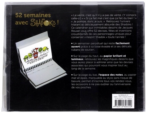 « La vérité, c'est qu'il n'y a pas de vérité. (Y compris celle-ci) » « Si ça fait mal c'est que ça fait du bien !! ». « Je pompe, donc je suis. » « Pour qu'il y ait le moins de mécontents possibles, il vaut mieux toujours taper sur les mêmes. » Retrouver l'univers hillarant, délicieusement absurde, loufoque et décalé des Shadoks ! Ce calendrier illustré des inimitables dessins de Jaques Rouxel nous offre les 52 devises et maximes les plus croustillantes de ces personnages uniques pour conserver « l'esprit Shadok » toute l'année !