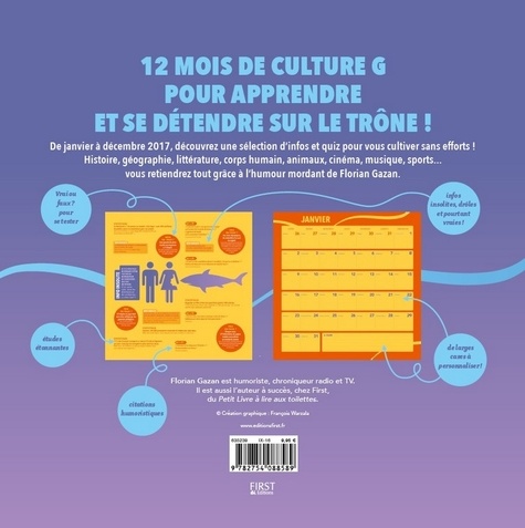 De janvier à décembre 2017, découvrez une sélection d'infos insolites, citations, statistiques et devinettes pour se cultiver sans efforts ! Histoire, géographie, littérature, langues, people et culture TV, corps humain, animaux, cinéma, musique, sports... vous retiendrez tout grâce à l'humour mordant de Florian Gazan !