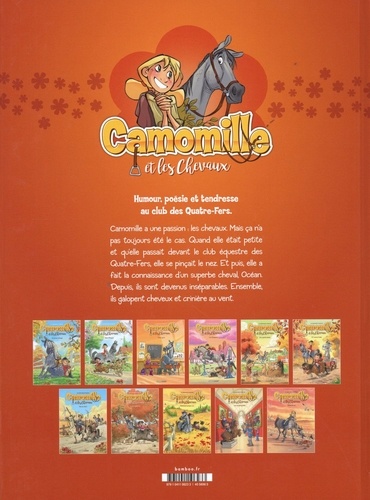 Camomille a une passion : les chevaux. Mais ça n'a pas toujours été le cas. Quand elle était petite et qu'elle passait devant le club équestre des Quatre-Fers, elle se pinçait le nez. Et puis, elle a fait la connaissance d'un superbe cheval, Océan. Depuis, ils sont devenus inséparables. Ensemble, ils galopent cheveux et crinière au vent.