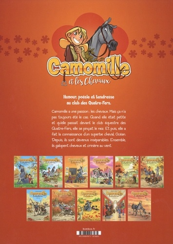 Humour, poésie et tendresse au club des Quatre-Fers. Camomille a 10 ans. Et elle a une passion : les chevaux. Mais ça n'a pas toujours été le cas. Quand elle était petite et qu'elle passait devant le club équestre des Quatre-Fers, elle se pinçait le nez. Et puis, elle a fait la connaissance d'un superbe cheval, Océan. Depuis, ils sont devenus inséparables. Ensemble, ils galopent cheveux et crinière au vent.