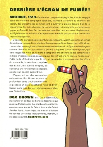 Mexique, 1519. Pendant les conquêtes espagnoles, Cortés, engagé dans une violente campagne coloniale, introduit la culture du chanvre. En secret, des autochtones commencent à cultiver la plante dans le but de la consommer. Parle truchement de la main-d'oeuvre immigrante, cette dernière gagne les Etats-Unis et fait des adeptes parmi les ouvriers noirs. Rapidement, les législateurs américains s'attaquent au cannabis, perçu comme le vice des "races inférieures ". On assiste alors au déploiement d'une propagande visant à susciter un climat de panique à propos d'une plante utilisée sans problème depuis des millénaires. Le cannabis est rangé parmi les substances du tableau I, où figurent des drogues comme l'héroïne. On ouvre ainsi la porte à la "guerre contre les drogues", qui cible les jeunes Noirs en nombre disproportionné et entraîne des centaines de milliers d'incarcérations, souvent pour des infractions mineures. Fondée sur l'idée de la "folie induite par le pot" et des études trompeuses sur les effets du cannabis, la relation complexe des Etats-Unis avec la drogue, où s'observe une forte dimension raciale, se poursuit encore aujourd'hui. S'appuyant sur des recherches exhaustives, Box Brown explore en profondeur cette troublante histoire et propose un essai graphique riche et divertissant sur le legs des lois relatives au cannabis aux Etats-Unis.