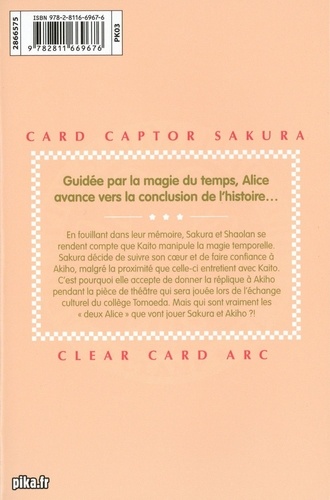 En fouillant dans leur mémoire, Sakura et Shaolan se rendent compte que Kaito manipule la magie temporelle. Sakura décide de suivre son coeur et de faire confiance à Akiho, malgré la proximité que celle-ci entretient avec Kaito. C'est pourquoi elle accepte de donner la réplique à Akiho pendant la pièce de théâtre qui sera jouée lors de l'échange culturel du collège Tomoeda. Mais qui sont vraiment les "deux Alice" que vont jouer Sakura et Akiho ? !