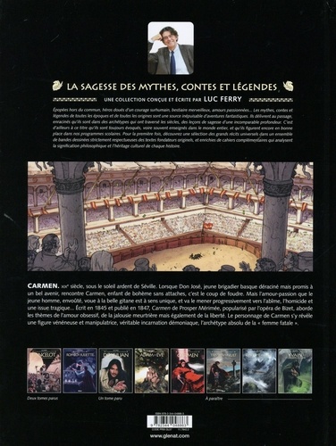 Passion fatale : le chef d'oeuvre de Mérimée en BD. Ecrite en 1845 et publiée en 1847, Carmen, la nouvelle de Prosper Mérimée, raconte l'histoire de l'amour fou d'un Basque déraciné pour une enfant de bohème, sans patrie ni attaches. Lorsque José, brigadier-brigand, rencontre Carmen, l'amour-passion à sens unique qu'il lui voue le mènera vers l'abîme et le féminicide. Cette tragédie aborde les sujets de l'amour obsessif, de la jalousie mais aussi de la liberté, et se déroule sous le soleil ardent de Séville. Le personnage de Carmen s'y révèle figure vénéneuse et manipulatrice, une véritable incarnation démoniaque. Luc Ferry redonne ici vie à ce récit légendaire qui a traversé les siècles et inspiré tant de représentations jusqu'à nos jours.
