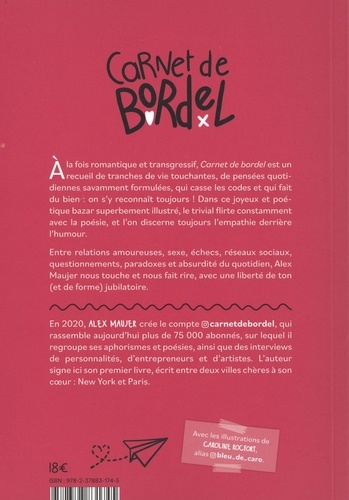 A la fois romantique et transgressif, Carnet de bordel est un recueil de tranches de vie touchantes, de pensées quotidiennes savamment formulées, qui casse les codes et qui fait du bien : on s'y reconnaît toujours ! Dans ce joyeux et poétique bazar superbement illustré, le trivial flirte constamment avec la poésie, et l'on discerne toujours l'empathie derrière l'humour. Entre relations amoureuses, sexe, échecs, réseaux sociaux, questionnements, paradoxes et absurdité du quotidien, Alex Maujer nous touche et nous fait rire, avec une liberté de ton (et de forme) jubilatoire.