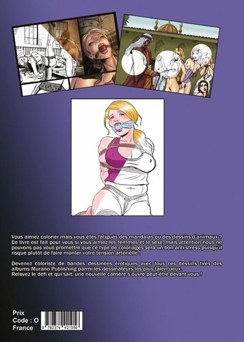 Vous aimez colorier mais vous êtes fatigués des mandalas ou des dessins d'animaux ? Ce livre est fait pour vous si vous aimez les femmes et le sexe, mais attention nous ne pouvons pas vous promettre que ce type de coloriages sera un bon anti-stress puisqu'il risque plutôt de faire monter votre tension artérielle ! Devenez coloriste de bandes dessinées érotiques avec tous ces dessins tirés des albums Murano Publishing parmi les dessinateurs les plus talentueux. Relevez le défi et qui sait, une nouvelle carrière s'ouvre peut-être devant vous !