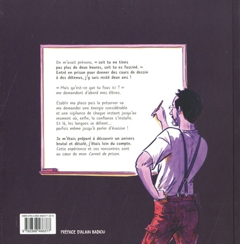 Chronique de deux années et demie d'intervention en maison d'arrêt On m' avait prévenu, " soit tu ne tiens pas plus de deux heures, soit tu es fasciné. " Entré en prison pour donner des cours de dessin à des détenus, j' y suis resté deux ans ! " Mais qu' est-ce que tu fous ici ? " me demandent d' abord mes élèves. Etablir ma place puis la préserver va me demander une énergie considérable et une vigilance de chaque instant jusqu' au moment où, enfin, la confiance s' installe. Et là, les langues se délient... parfois même jusqu' à parler d' évasion ! Je m' étais préparé à découvrir un univers brutal et désolé, j' étais loin du compte. Cette expérience et ces rencontres sont au coeur de mon Carnet de prison .